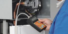 Zwei Anlagenmechaniker die eine Anlage mit einem Messgerät prüfen